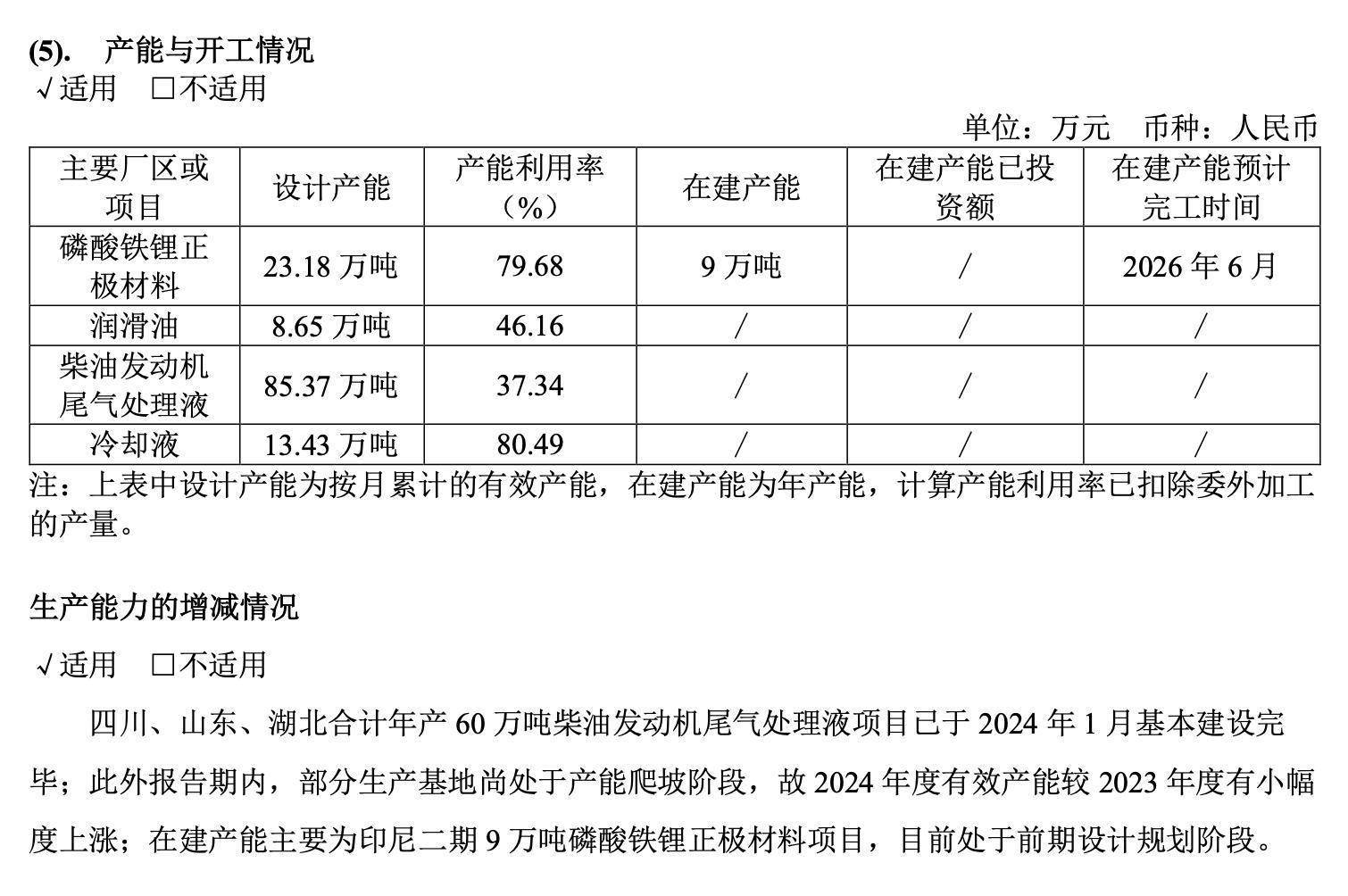 这个数字之所以令人惊讶,在于它刚好压在龙蟠科技当下的能力边界上。根据龙蟠科技2024年年报,其磷酸铁锂正极材料的设计产能为23.18万吨,产能利用率约为79.68%,折算下来实际年产量接近20万吨。尽管公司尚有9万吨在建产能,但要到2026年6月才能完工,而且这部分产能在海外,远水解不了近渴。